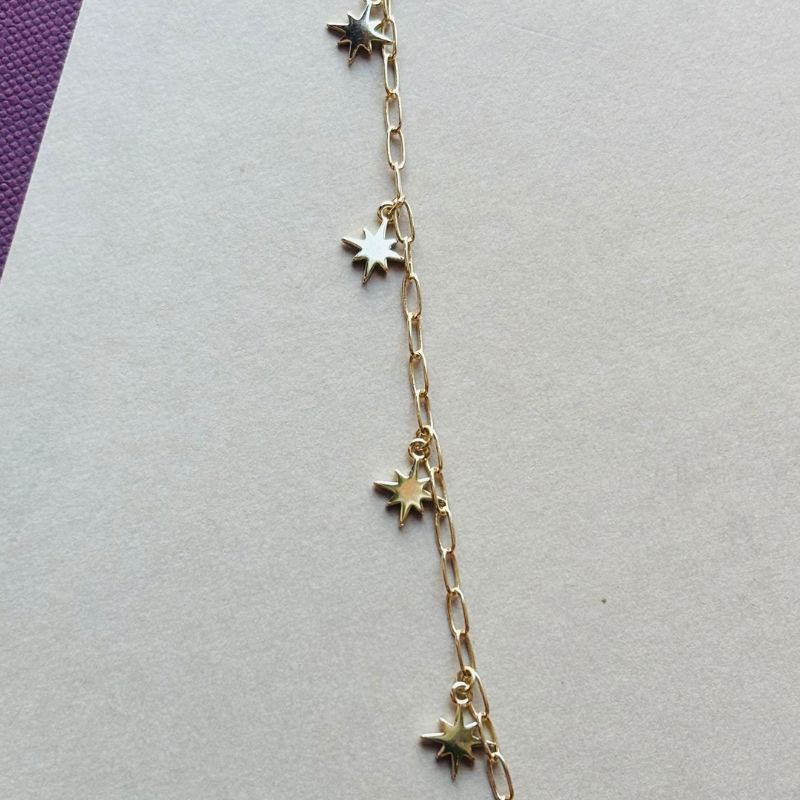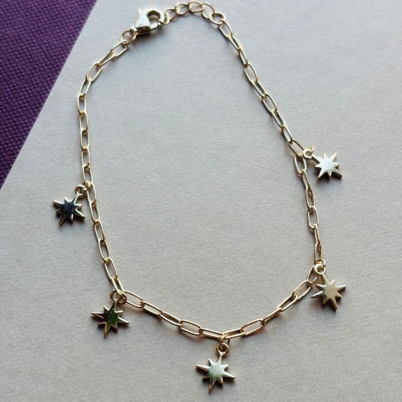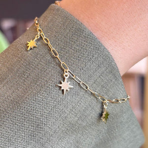 Made of solid sterling silver, this adjustable bracelet is adorned with a row of 5 north star charms to add some movement to your wrist. Available in 14 kt yellow gold vermeil.