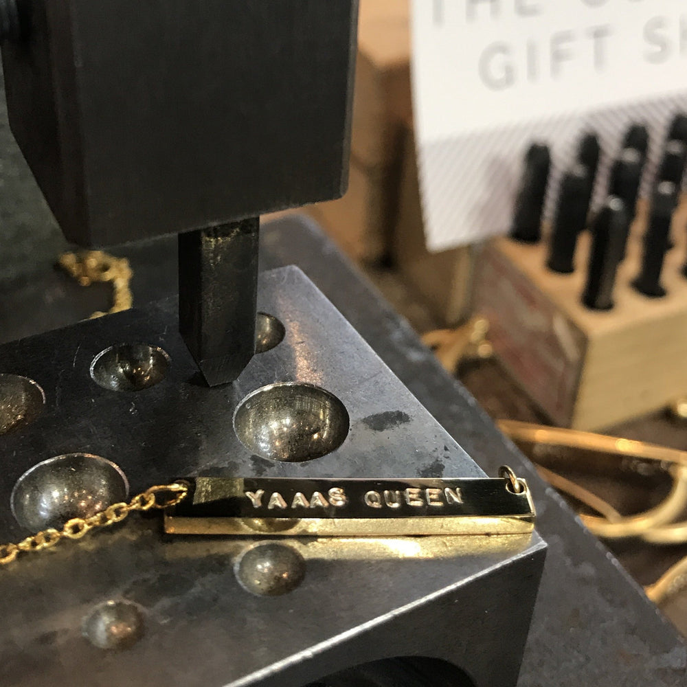 Our hand stamped bar necklaces are fully customizable. Fill with inside jokes, phrases, initials, dates, names of towns, streets, parks, etc. The options are endless. All bar necklaces are made of solid stainless steel. Have us hand stamp your very own custom bar necklace today!