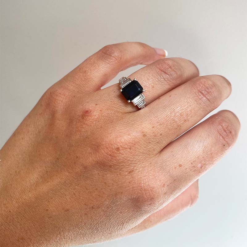 We love the sleek and modern feel of this black sapphire and diamond ring set in 14 kt gold. The dark color of the black center stone is beautifully balanced by the bright, baguette and princess cut side diamonds.