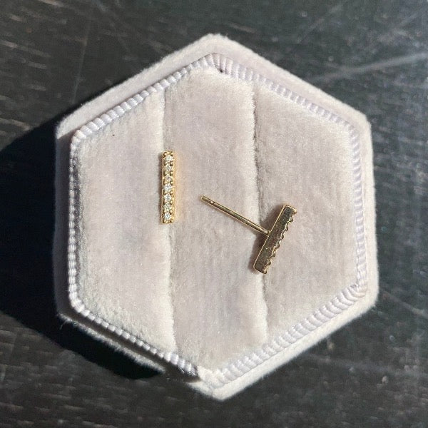 This single bar shaped stud has round cut diamonds set in solid 14 kt gold settings.