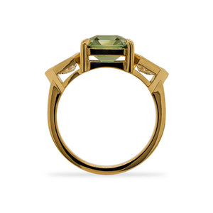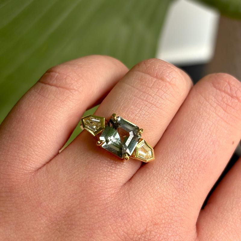 This one of a kind sapphire and diamond ring is a true showstopper. The blue/green to gray color changing as her cut sapphire is flanked by a pair of shield cut diamonds. Set in an 18 kt gold setting, claim her today before she is gone forever. *Please contact us if you would like this ring resized.*