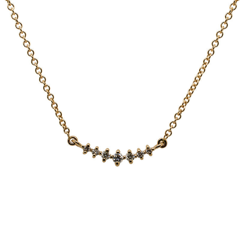Front view of shadow band with 7 round cut diamonds increasing in size from the outside in, set in 14 kt yellow gold.