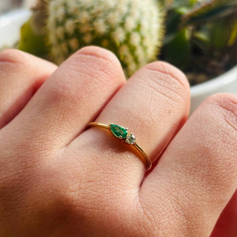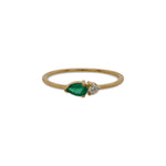 Front view of pear cut emerald and round diamond ring cast in 14 kt yellow gold.