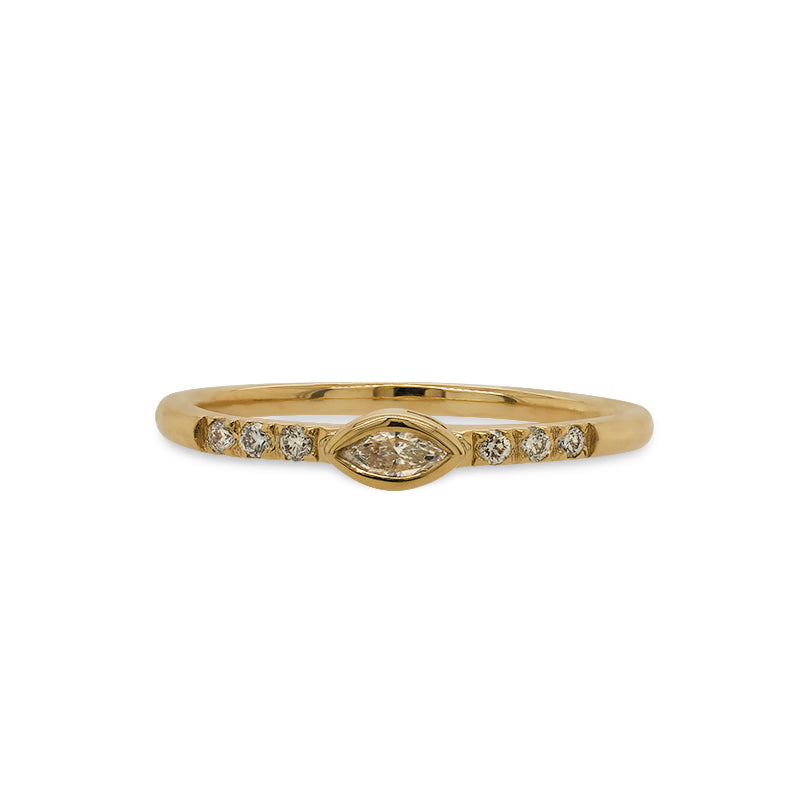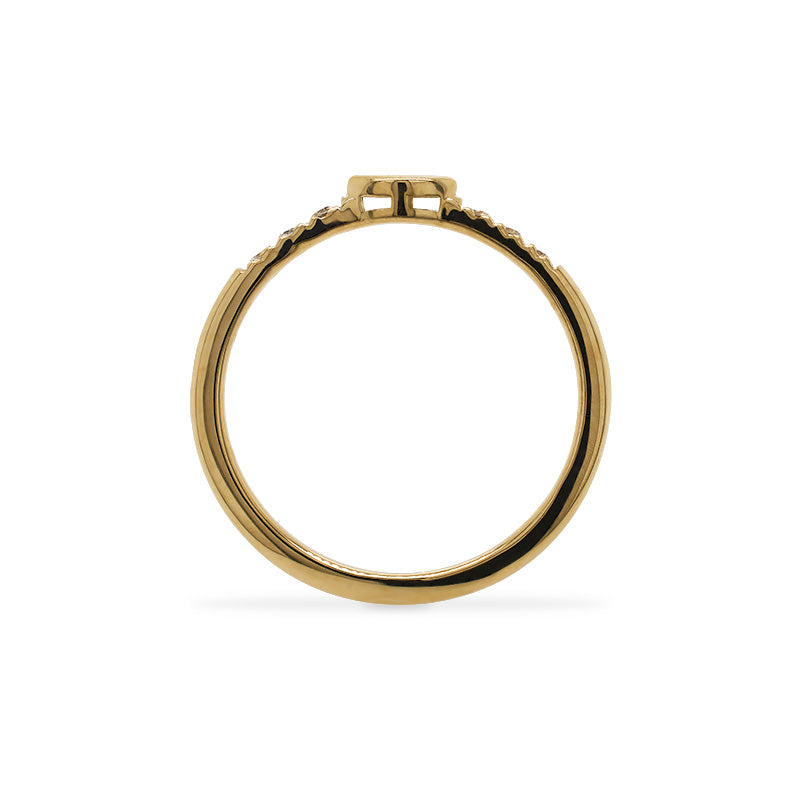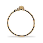 SIde view of a V shaped ring with 10 round cut diamonds cast in 14 kt yellow gold by King + Curated.