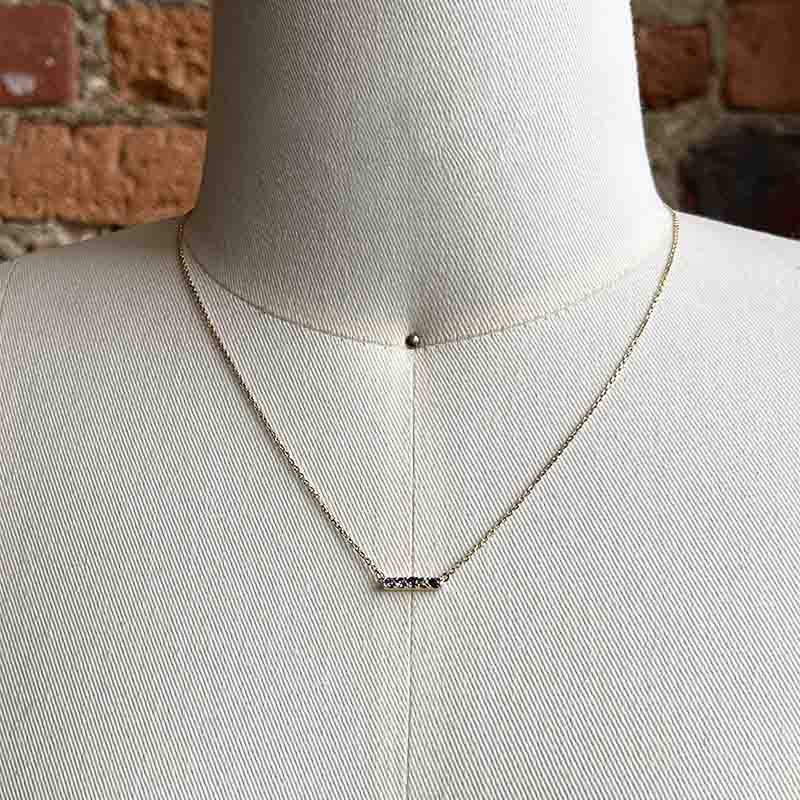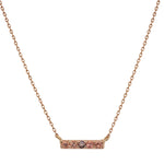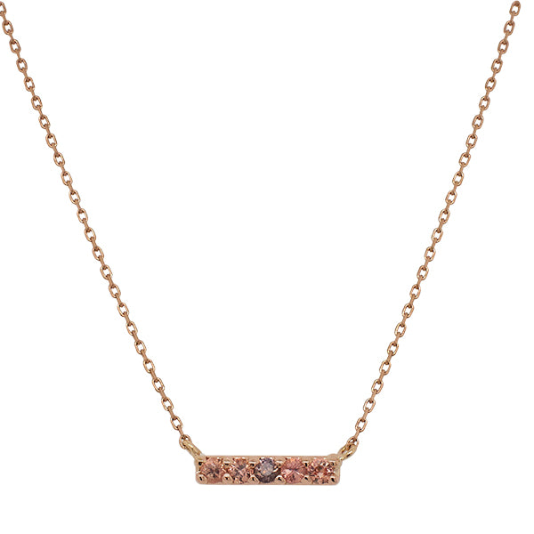 Front view of a solid 14 kt rose gold bar necklace with 5 round cut, warm colored sapphires.
