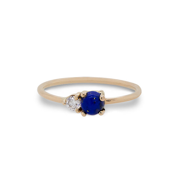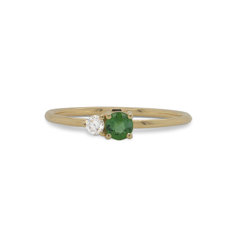 Front view of an asymmetrical oval cut, green sapphire and diamond ring cast in 14 kt yellow gold by King + Curated.