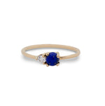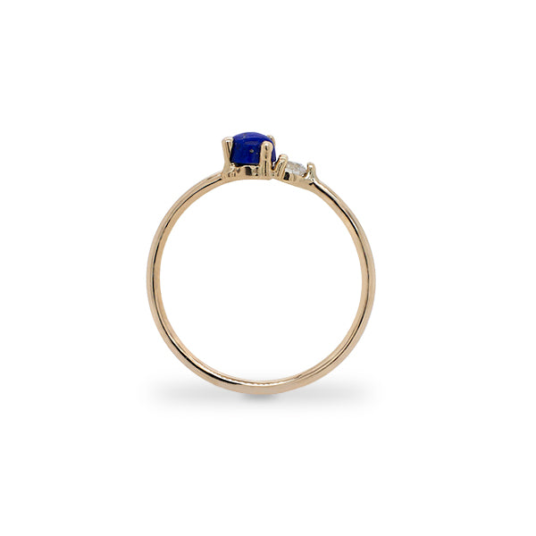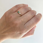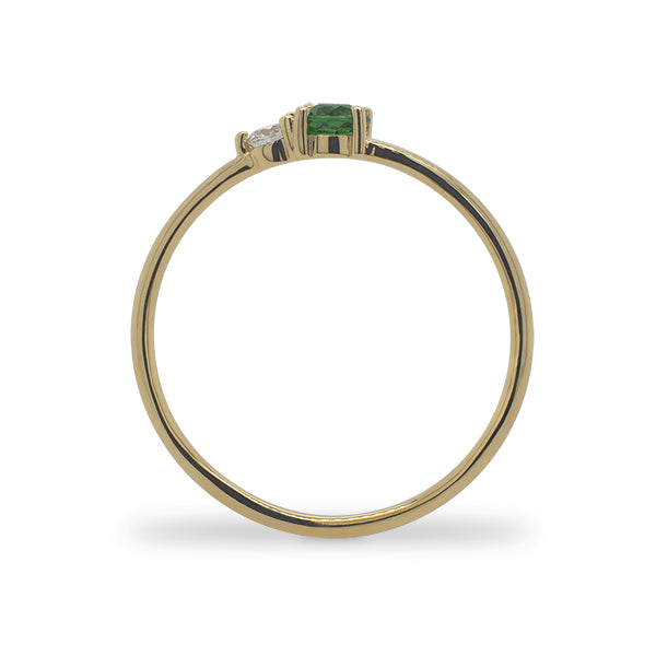 Side view of an asymmetrical oval cut, green sapphire and diamond ring cast in 14 kt yellow gold by King + Curated.