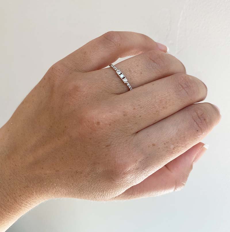 View on left ring finger of diamond Kari shadow band with 21 round cut diamonds for a tcw of 0.32, and cast in 14kt rose gold.