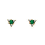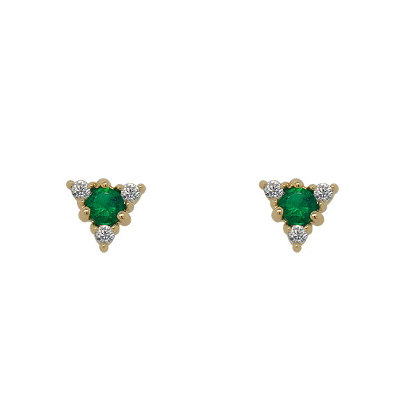 Front view of small, four prong emerald studs set in 14 carat yellow gold. Displayed on a white background.