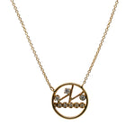Front view of a cabochon cut opal and triple round cut diamond pendant necklace made of solid 14 kt yellow gold.