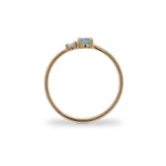 Through the finger view of an asymmetrical cabochon turquoise ring with 3 small diamonds and 1 medium size diamond and cast in 14 kt yellow gold.
