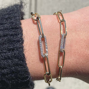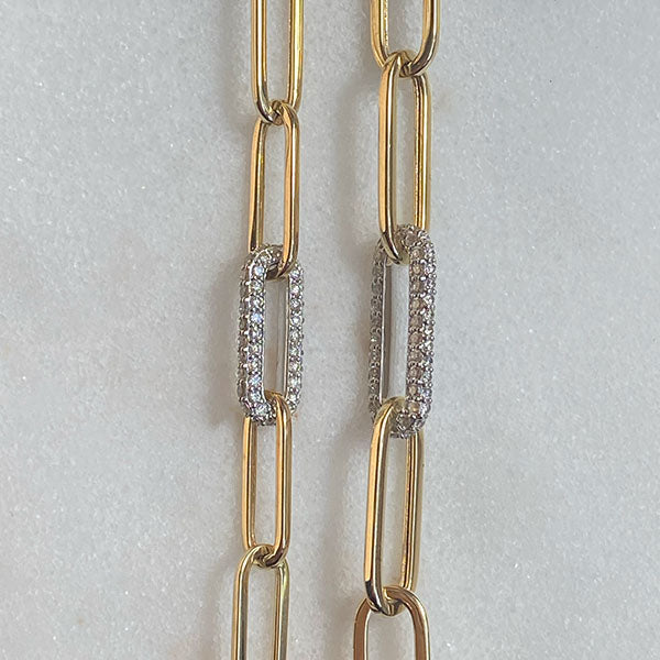 Our chunky paperclip bracelet is cast in 14 kt yellow gold with a diamond pavé and white gold center link.