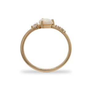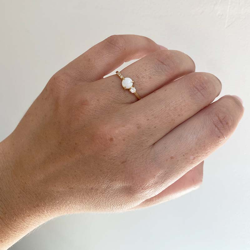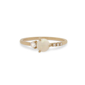 This opal and diamond ring is a great everyday ring. It's on the dainty side, yet the center opal and side diamonds make a big statement. This 14 kt gold ring boasts a center opal, side diamond, and 3 petite, pavé set diamonds.
