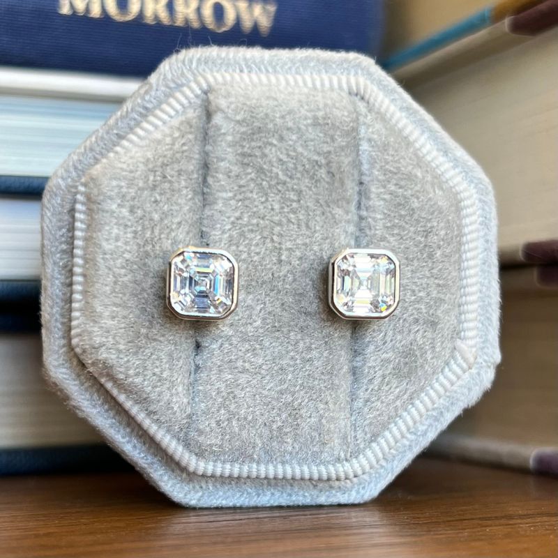 These bezel asscher cut studs are available in either sterling silver or 14 kt yellow gold vermeil.