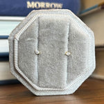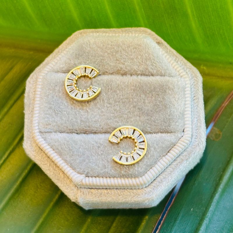 Sterling silver semi circle studs with tapered baguettes on a display tray with a green background.