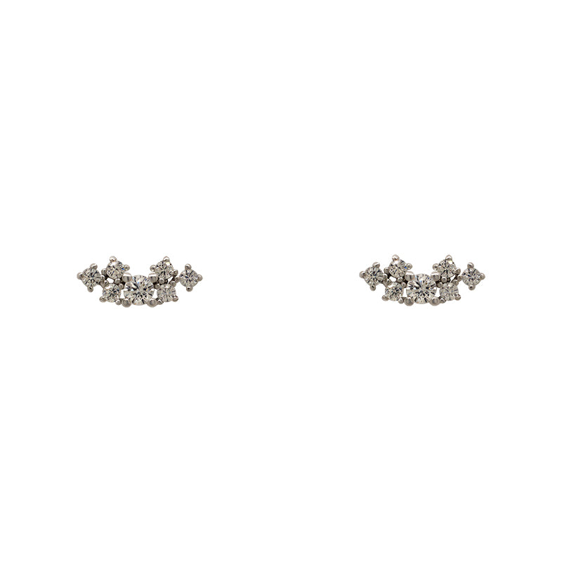 Tiny half-moon studs with a mix of pear, round, and marquise crystals clusters and petite pearls. Shown on a white background.