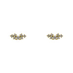 A pair of 14 kt yellow gold vermeil cluster studs with 4 round and 7 baguette crystals on each stud, and on a white backgtround.