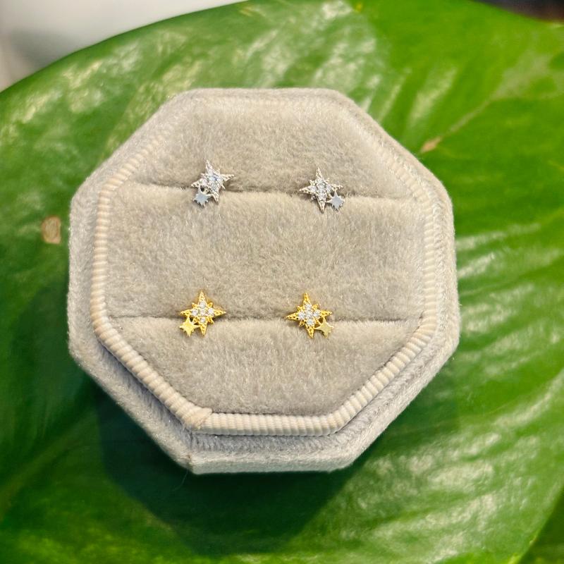Tiny starburst studs made of sterling silver with round crystal centers on a white background.