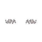 A pair of sterling silver studs with baguette and round cut crystals shown on a white background.