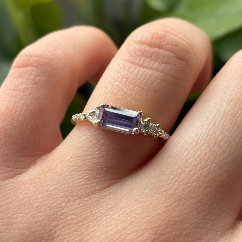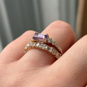 A stunning emerald cut lavender sapphire with trillion and round side diamonds. Cast in 14kt yellow gold. Shown stacked our mixed cut eternity ring, The Brie. Truly one of a kind!