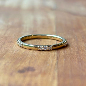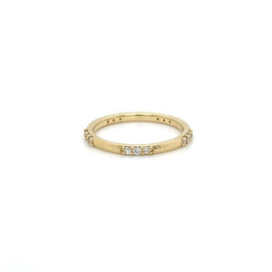 For those who prefer the dimension of gold between the sparkle of diamonds, the Milta is the perfectly balanced band. Cast in 14 kt yellow gold, a great option for a wedding band or to add that extra sparkle to your daily ring stack.