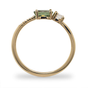 With a modern, asymmetrical design, this oval cut sapphire and diamond ring is true stunner.