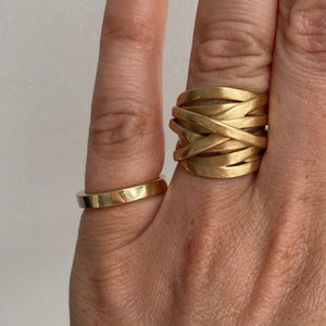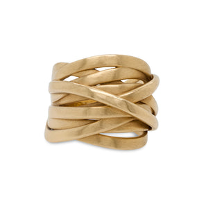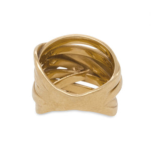 This statement ring is cast in 18 kt gold with a brushed satin finish. The design eludes to a ribbon being wrapped and crisscrossed around the finger. A hefty piece that is easy to wear.