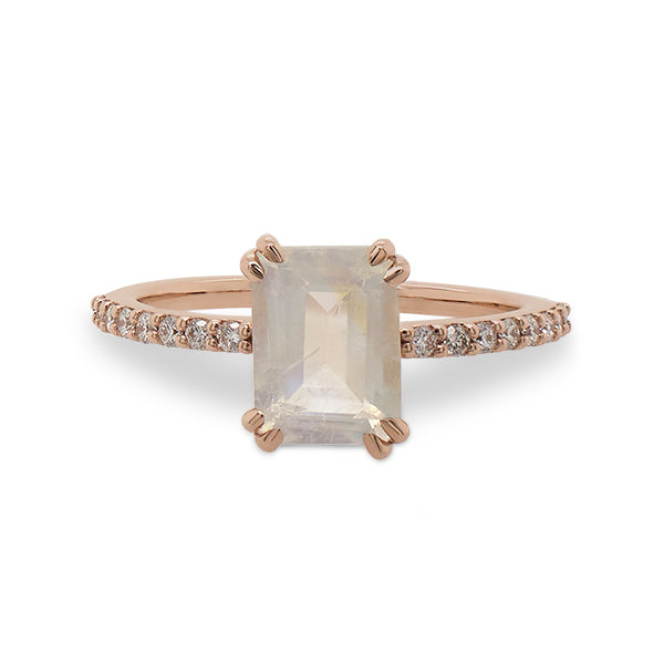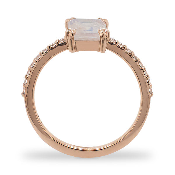 Cast in 14 kt gold, this custom cut moonstone ring is set with double claw prongs and is surrounded by smaller, round cut diamonds.