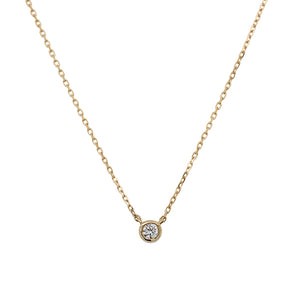 This bezel set diamond solitaire necklace is set in solid 14 kt gold. Available in 14 kt yellow, 14 kt white and 14 kt rose gold.