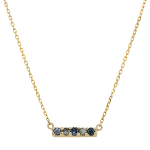 Add a pop of color to your day. A design borrowed from our 5 diamond bar necklace, this bar necklace boasts five round cut sapphires.