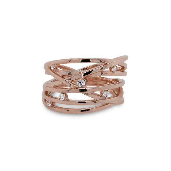 Cast in solid 14 kt gold and sprinkled with several round cut diamonds, we love the look and feel of the Noreen ring.