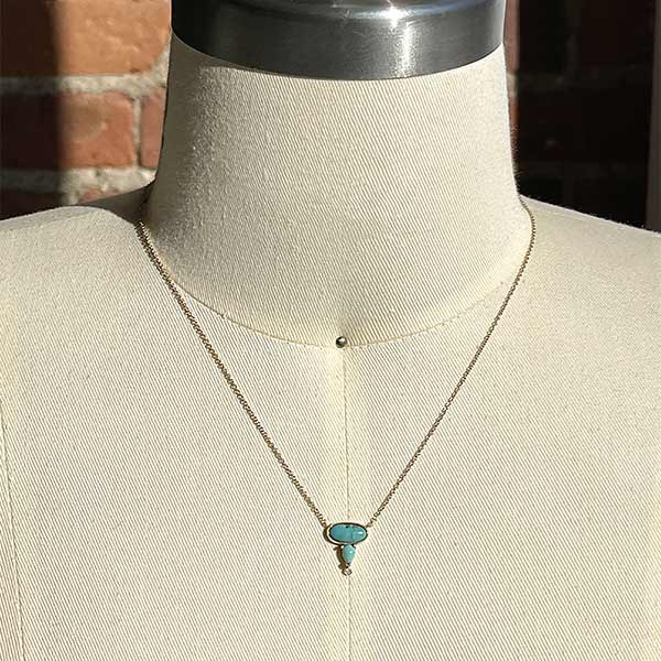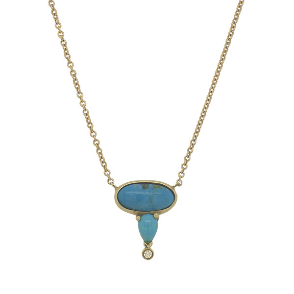 We love this combo of the pear and oval cut turquoise stones paired with a classic round cut diamond. Set in 14 kt gold, a great everyday necklace.