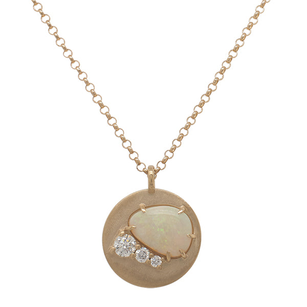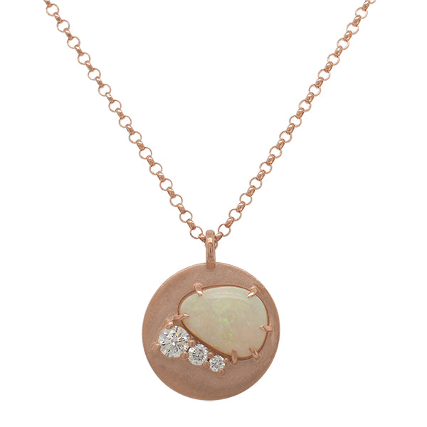 A modern approach to a classic pendant shape. This pendant has one organic, cabochon cut opal and 3 round cut diamonds.